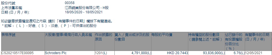 智通财经APP获悉,香港联交所最新资料显示,5月12日,Schroders Plc减持江西铜业(00358)479.1万股,每股作价20.74港元,总金额约为9938.6万港元。减持后最新持股数目约为9383.6万股,最新持股比例为6.76%。