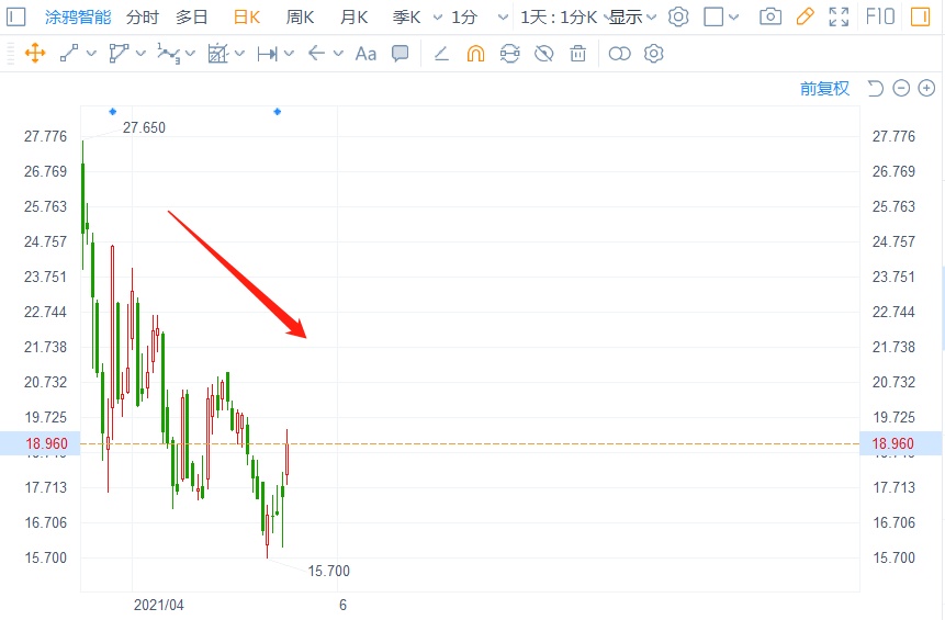 与此同时,自3月18日上市以来,涂鸦智能股价也一直呈震荡下行的态势:上市第一天股价大涨19.05%之后便开始往下走,第四天股价便跌破股价发行价,目前股价报于18.96美元,累跌近30%。