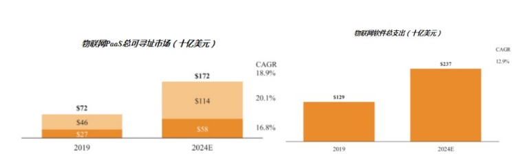 CIC数据显示,2019年物联网PaaS的总可寻址市场为722亿美元,并预计从2019年到2024年整个IoT PaaS市场将以18.9%的复合年增长率增长,达到1717亿美元。物联网SaaS市场方面,IDC数据披露,2019年物联网软件支出已达到1292亿美元,预计到2024年将增长至2370亿美元,复合年增长率为12.9%。