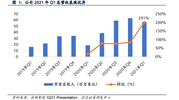 据财报显示,今年一季度,涂鸦智能的物联网PaaS部署达到3920万,物联网PaaS客户约为2200家。同期其优质客户数量为 216个,较 2020 年底的 188 个增长 28 个。另外,其的平台注册开发者数量从2020年底的26.2万多名增长至2021年Q1的32.4万多名,增幅为23.7%。可以看到的是,上述数据的增长在一定程度上也将产生一定正向作用,进而促进其营收延续高增长之势。