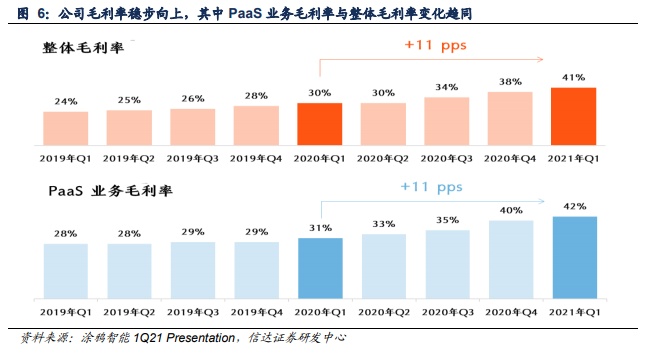 答案,非也。身处物联网这么一条高科技赛道,涂鸦智能的毛利率实际上还是比较高的:2021 年 Q1 ,其整体毛利率达到 41%,同比增长 11 个百分点,其中 PaaS 业务毛利率 42%,同比增长11 个百分点,SaaS 和其他毛业务的毛利率为 75%,智能设备分销毛利率为 19%。