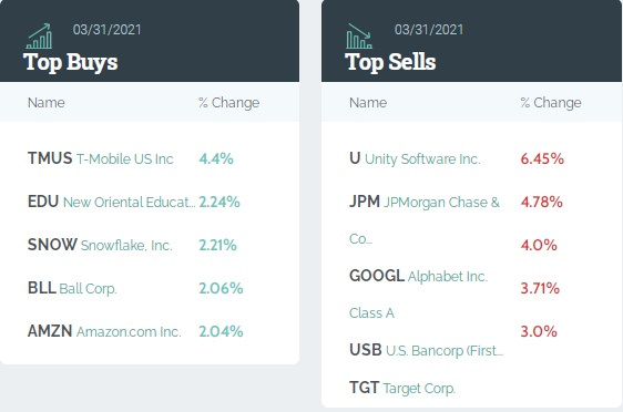 从持仓比例变化来看,前五大买入标分别是:T-Mobile(TMUS.US)、新东方、Snowflake(SNOW.US)、鲍尔包装(BLL.US)、亚马逊(AMZN.US)。前五大卖出标的分别是:Unity Software(U.US)、摩根大通(JPM.US)、谷歌A(GOOGL.US)、美国合众银行(USB.US)、塔吉特(TGT.US)。