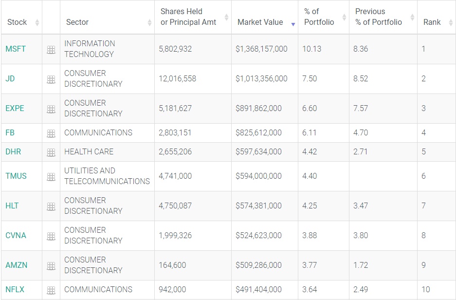 微软(MSFT.US)、京东(JD.US)和Expedia(EXPE.US)位列前三,分别占投资组合比例10.13%、7.5%和6.6%。