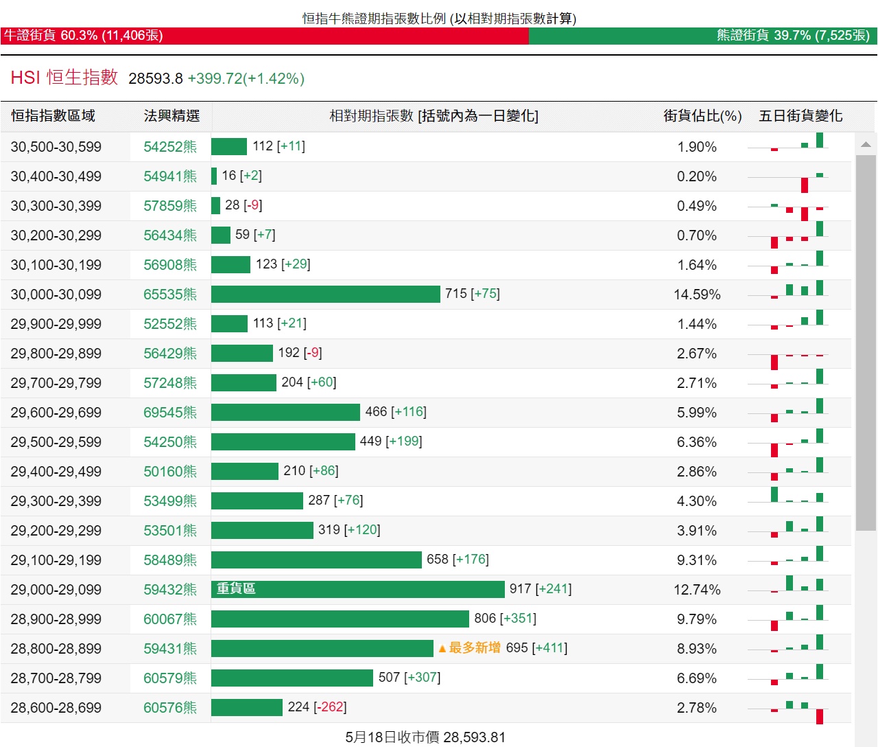 智通财经APP获悉,截至5月18日,恒指最新的牛熊街货比例为60:40。