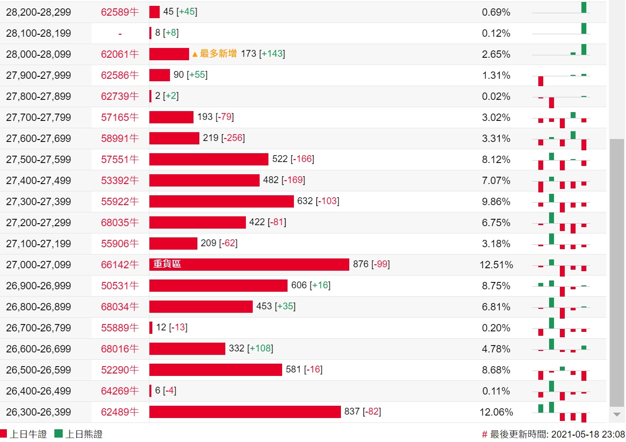 牛证街货重货区在27000-27099区间,该区间最新牛证数量为876张,较上一交易日减少99张;最多新增在28000-28099区间,该区间最新牛证数量为173张,较上一交易日增加143张。