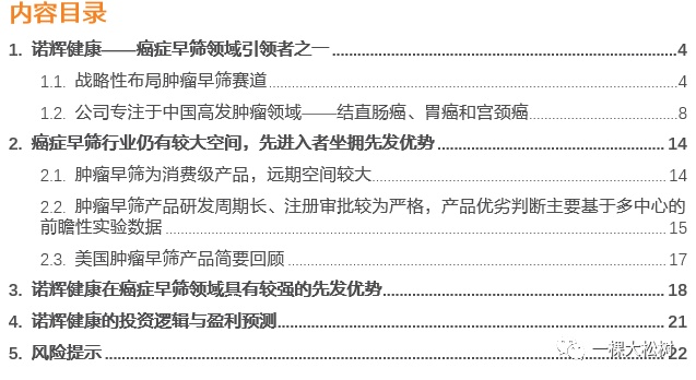 业绩预测和投资评级:诺辉健康的常卫清为中国肿瘤早筛第一个获批的三类医疗器械注册证,我们看好其凭借先发优势和商业化推广快速增长,我们预计2021-2023年公司营业收入分别为1.85、4.52和10.38亿元,首次覆盖给予“买入”评级。