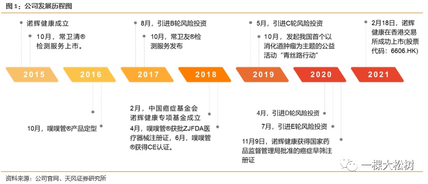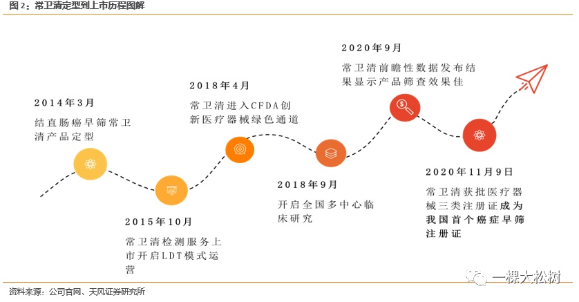 公司深度耕耘结直肠癌早筛,产品从定型到上市历经7年。2015年诺辉健康成立,致力于研发居家癌症早筛产品。公司历经实验室设计5年,于2014年3月结直肠癌早筛常卫清产品定型。2015年10月常卫清检测服务上市,开启LDT模式运营,同年11月诺辉健康成立;2018年4月常卫清进入CFDA创新医疗器械绿色通道并于9月开启全国多中心临床研究,2020年9月常卫清前瞻性数据发布,结果显示产品筛查效果良好,2020年11月9日常卫清获批医疗器械三类注册证,也是中国首个癌症早筛注册证。