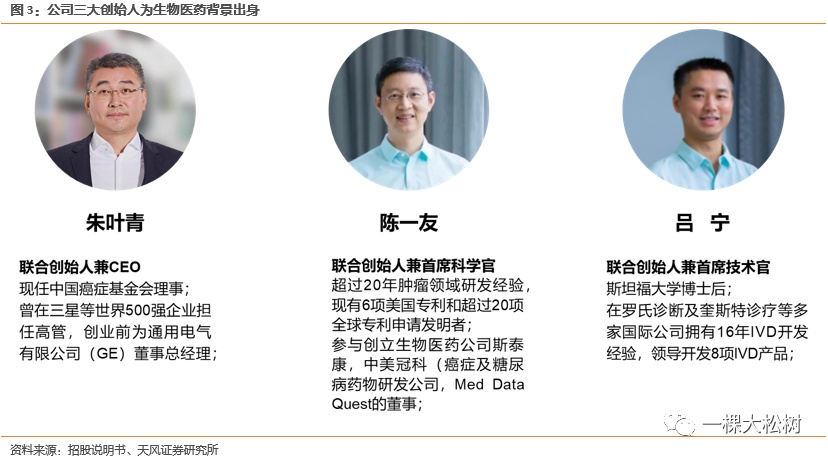 创始团队生物医药背景出身。公司三位创始人朱叶青、陈一友和吕宁为北京大学92届生物化学系同学,三位创始人分工协作:首席执行官朱叶青曾担任通用电气有限公司董事总经理,有超过20年管理经验,现任中国癌症基金会理事;首席科学家陈一友博士从2003年开始创立数家与抗肿瘤药物研发、癌症治疗疗法相关企业,拥有超过20年肿瘤领域研发经验,现有6项美国专利和超过20项全球专利申请发明者;首席技术官吕宁博士在罗氏诊断及奎斯特诊疗等多家国际公司拥有16年IVD开发经验,领导开发8项IVD产品。