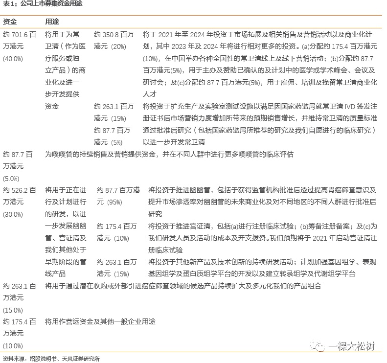 诺辉健康于2021年2月18日在港交所挂牌上市,发行7659.8万股,发行价格为每股26.66港元,共募集约20.42亿港币,其中40%的资金用于结直肠癌早筛产品常卫清商业化,30%的资金用于胃癌早筛产品幽幽管和宫颈癌早筛产品宫证清等新产品的研发。