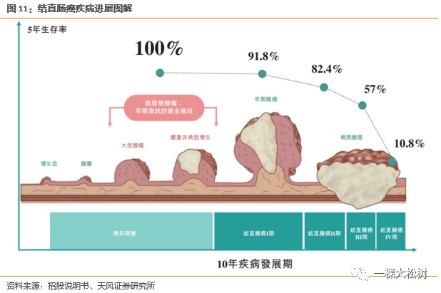 结直肠癌为发生在结肠和直肠的癌症,中国是全球结直肠癌发病数最高的国家,2019年中国城市地区每10万人中发病率为37.16例,是农村地区的1.5倍;结直肠癌确诊人数从2015年的38.8万到2019年的44万。结直肠癌演变到晚期一般需要历经10年,从最早期的癌前病变阶段、1期、2期、3期和4期的患者生存率分别为100%、91.8%、82.4%、57%和10.8%。由于进展性腺瘤一般无症状很容易忽视,因此开展预防早期筛查对于患者后续生存率具有较大影响。