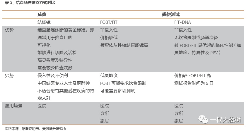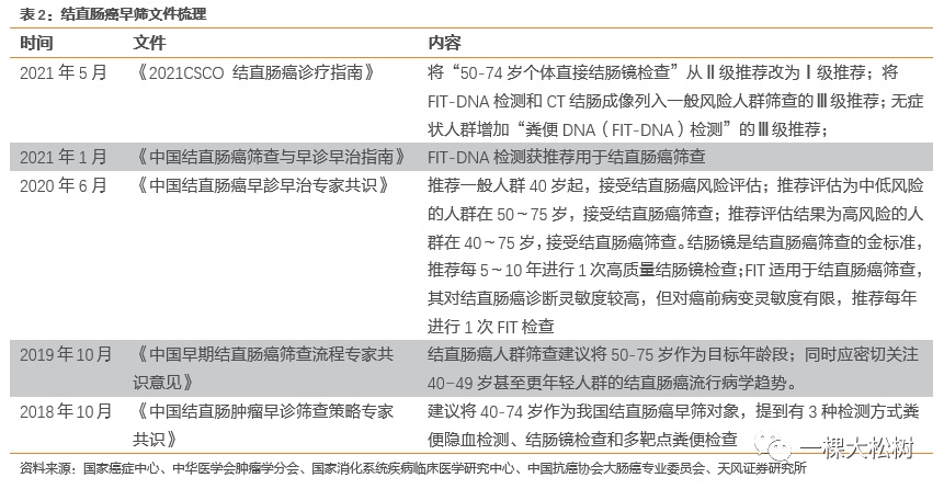 结直肠癌目前主流筛查是肠镜,指南已将多靶点粪便FIT-DNA检测纳入筛查方法。目前肠镜是结直肠癌确诊的金标准,但因为肠镜检查有局限性——使用时需要侵入,检查舒适度差,且有副作用风险,部分患者不适用(例如糖尿病、高血压患者不建议做肠镜检查);与此同时中国肠镜检查资源有限,全国只有约30%医院能提供肠镜检查,排队等待周期长。常卫清采用的多靶点粪便DNA测试相比于肠镜依从性高,检测难度低,且可以居家检测。目前FIT-DNA筛查方式已纳入结直肠癌早筛指南,中长期看,我们预计多靶点粪便FIT-DNA检测将逐步成为结直肠癌早筛主流。