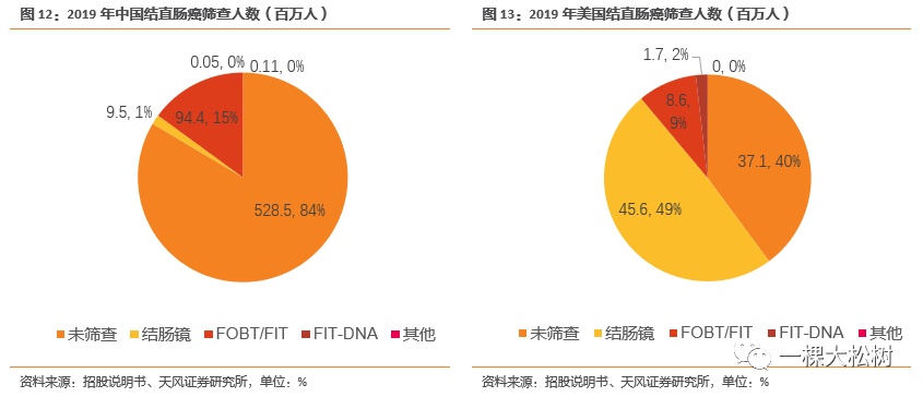 中国结直肠癌筛查渗透率低。现阶段肠镜为中国结直肠癌筛查的主流方式,对比来看,使用率远低于美国:2019年中国每10万人使用肠镜677次,而美国为14569次,而在结直肠癌早筛人群中使用肠镜的比例也远低于美国:2019年中国结直肠癌使用肠镜筛查人数占总筛查人数的比重仅1%,而美国占比49%。我们预计未来随着人们疾病早筛的意识提升和筛查手段的普及,结直肠癌筛查渗透率有望提升。