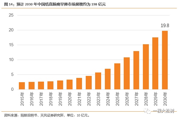根据中国药物协会建议——年龄介于40-74岁的人群需定期进行结直肠癌筛查,2019年符合结直肠癌筛查人数为6.3亿人,预计到2030年增加到7.58亿人;结直肠癌高危人群1.2亿人,预计到2030年增加到1.6亿人。假设未来结直肠癌筛查渗透率逐年提升,2019年为16.4%,预计到2030年有望提升至39.8%,根据弗若斯特沙利文报告,预计到2030年中国结直肠癌早筛市场规模198亿元。