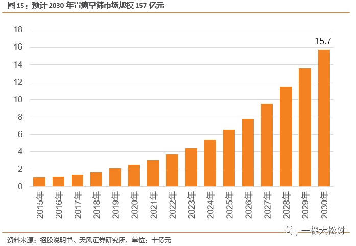 根据中国抗癌协会颁布的《中国早期胃癌筛查流程专家共识意见(草案)》,胃癌筛查主要是针对40岁以上人群定期检查,2019年符合胃癌筛查人数为6.9亿人,预计到2030年增加到8.08亿人,年复合增长率为1.4%。现阶段胃癌筛查渗透率偏低,未来胃癌筛查渗透率逐年提升,2019年为21.6%,预计到2030年渗透率提升至56.5%,根据弗若斯特沙利文报告,预计2030年中国胃癌早筛市场规模157亿元,年复合增长率超过20%。