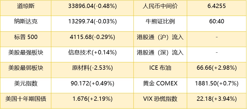 1、 隔夜美股截至收盘,道琼斯指数跌164.62点,跌幅0.48%,报33896.04点;标普500指数跌12.15点,跌幅0.29%,报4115.68点;纳斯达克综合指数跌3.9点,跌幅0.03%,报13299.74点。港股ADR指数也下跌,按比例计算,收报28500点,跌93.29点或0.33%。