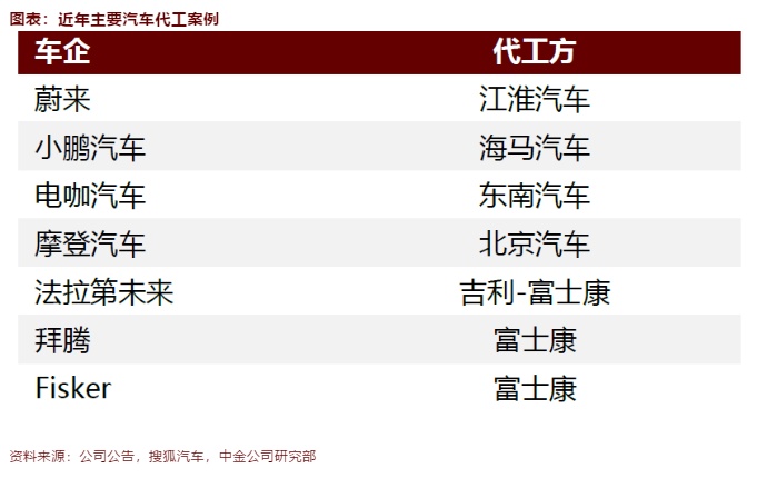 过去汽车行业代工业态并不主流,但有例可循。例如汽车零部件制造商麦格纳,截至2020年底,已经为各汽车企业代工了30款车型,合计产量超过330万辆,其中不乏宝马、戴姆勒、捷豹路虎等豪华汽车品牌。近期和国内例如北汽合作,也在加速在华布局。蔚来(NIO.US)和江淮的合作也是新势力在早期的成功典范。