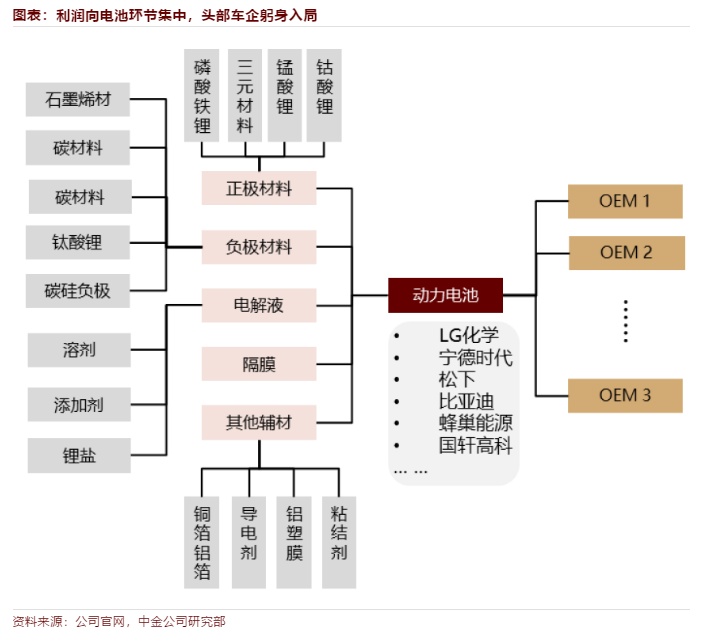 但出于对利润和供应链考量,头部车企不得不躬身入场。尽管稳态下规模化效应车企自制电池并不占优,但我们仍观察到大众计划自建240Gwh电池产能,长城旗下蜂巢能源预计在2025年全球布局至200Gwh实现产能跨越。主机厂在不具备经济性的条件下,仍坚持自制电池,我们觉得主要是出于三点考量:1)目前新能源产业链整车环节普遍无法盈利,利润向电池环节集中,头部车企有打破现有格局、重新分配利润的渴望;2)电池厂商话语权较高且集中度高,主机厂对核心零部件供应链安全存在担忧;3)自供电池市占率与短期产品推出节奏相关,由于大众集团激进的电动车战略规划,动态情况下,存在时点使得大众电池市占率可以与第三方媲美。
