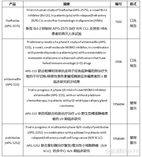 今年,亚盛医药旗下三个细胞凋亡管线品种的四项临床研究入选ASCO年会,其中两项进展获选口头报告,分别为Bcl-2抑制剂APG-2575的全球I期临床研究、新型MDM2-p53抑制剂APG-115联合帕博利珠单抗的全球II期临床研究。