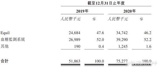 分产品来看,血糖监测系统收入略高于Equil。2019年和2020年血糖监测系统收入分别为2698.9万元及3929万元,分别占总收入比例的52%及52.2%;而Equil期内收入分别为2468.4万元和3474.2万元,分别占总收入比例的47.6%和46.2%。