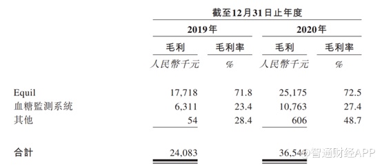虽然血糖监测系统营收占比略胜Equil一筹,但从毛利率角度来看,Equil毛利率远远高于血糖监测系统。招股书显示,微泰医疗2019年和2020年毛利率为46.4%和48.5%,其中Equil毛利率分别为71.8%和72.5%,而营收占比较高的血糖监测系统毛利率仅为23.4%和27.4%,由此来看,Equli才是微泰医疗的核心利润来源。