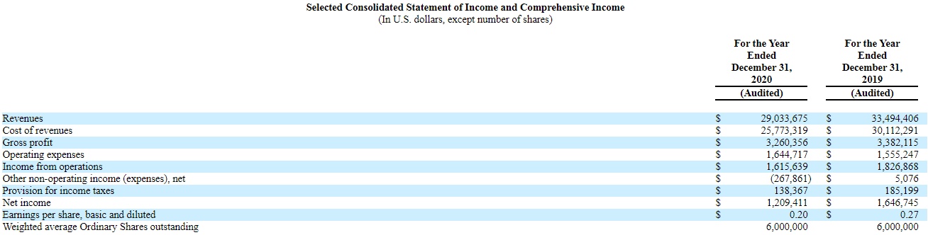 2020年,净利润为120.94万美元,上年同期为164.67万美元,同比下降26.6%;毛利润为326.04万美元,上年同期为338.21万美元。