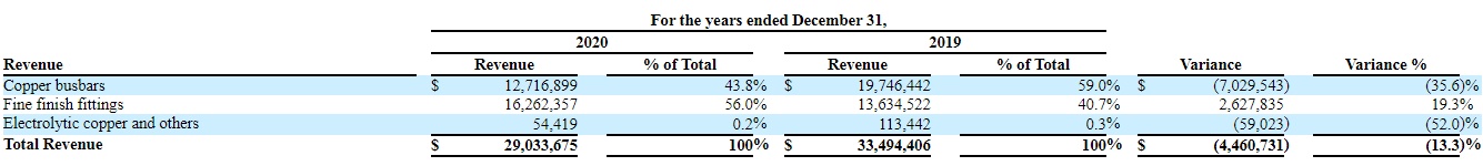 该公司收入主要来自铜母线和精加工配件。2020年,公司的铜母线和精加工配件销售收入占营收的比例分别为43.8%和56%。