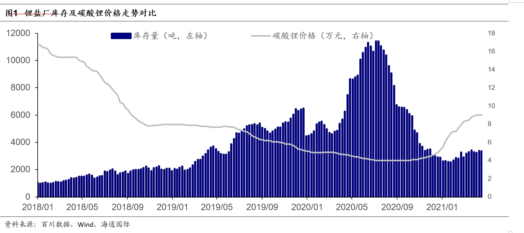 但随后,随着疫情控制,海外复工复产,新能源汽车销量连连走高,带动需求走强,锂盐厂开启去库,机制2020年12月库存降至3000吨左右,市场开始发现锂盐供需紧张,锂价开始快速上涨,二者关联度较高。