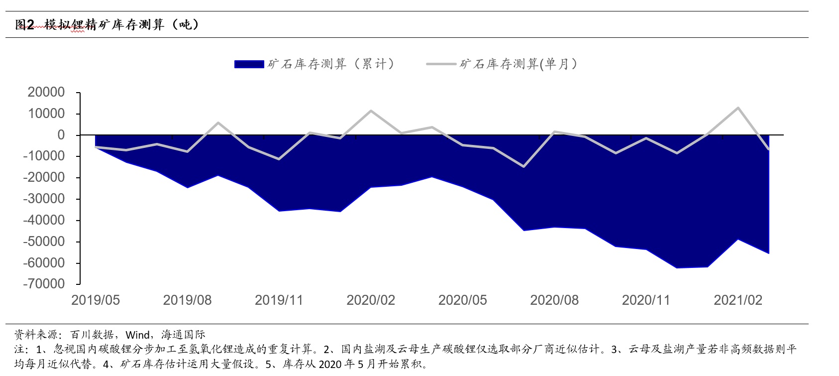 再来看一下国内矿石库存数据情况。由于没有直接统计的矿石库存情况,我们采用进口锂精矿数据与碳酸锂、氢氧化锂产量(去除盐湖及云母产量数据)近似估计。但是由于海外盐湖进口碳酸锂还有可能二次加工以及碳酸锂产氢氧化锂存在重复计算等影响,我们在测算中运用了较多的假设,我们认为该数据绝对值无意义,但是单月库存变化趋势仍能说明一些问题。