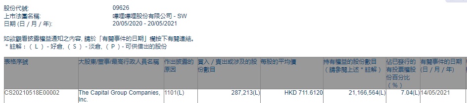 智通财经APP获悉,香港联交所最新资料显示,5月14日,The Capital Group Companies, Inc.增持哔哩哔哩-SW(09626)28.72万股,每股作价711.6港元,总金额约为2.04亿港元。增持后最新持股数目约为2116.6万股,最新持股比例为7.04%。