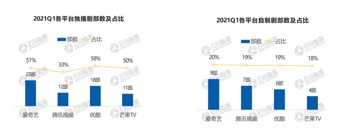 从独播剧和自制剧数量来看,2021年Q1爱奇艺独播剧占比50%以上,共有23部独播剧,为四家平台中最多。同时自制剧方面,Q1爱奇艺自制部数占比在20%左右,亦为四家平台之首。在这其中,期内上新国产剧集中,其视频平台自制剧有效播放105亿,占比达42%。