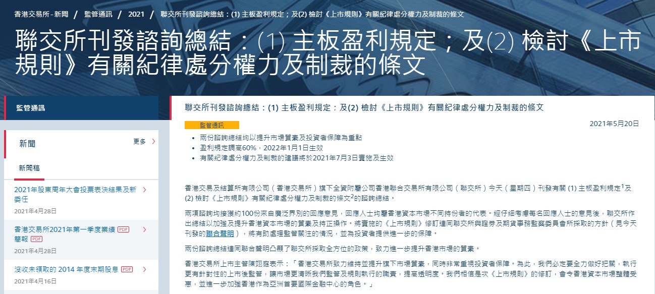 香港交易所网站显示,港交所旗下全资附属公司香港联合交易所有限公司(联交所)今天(星期四)刊发有关(1)主板盈利规定及(2)检讨《上市规则》有关纪律处分权力及制裁的条文的谘询总结。
