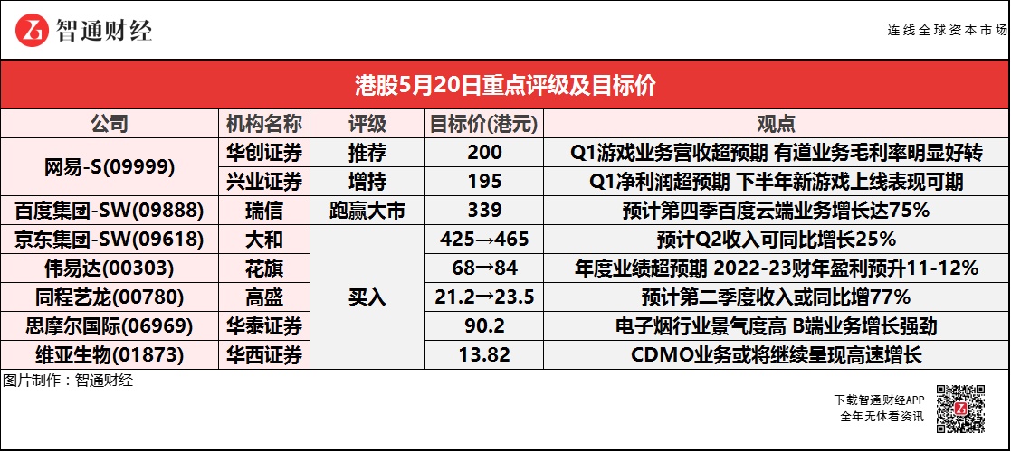 兴业证券称,网易-S(09999)Q1净利润超预期,下半年新游戏上线表现可期,且有道教育及网易云音乐成本端逐渐缩窄,预计2021-22年归母净利163/180亿元;