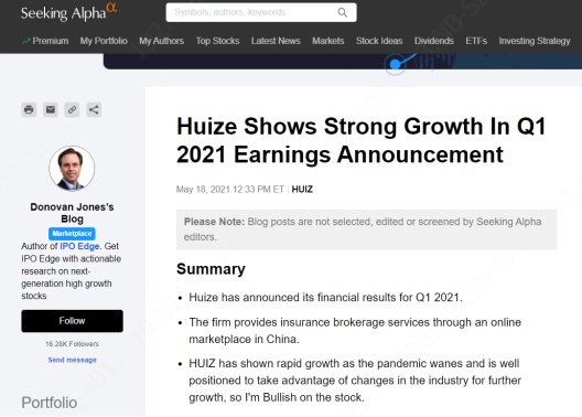 近日,有金融分析专家在全球知名财经投资平台Seeking Alpha发表文章,评论慧择(HUIZ.US)2021年第一季度财报表现亮眼。文章指出,慧择一季度实现营收和经营利润大幅增长,与同类型公司相比估值较低,因此看好其投资价值。