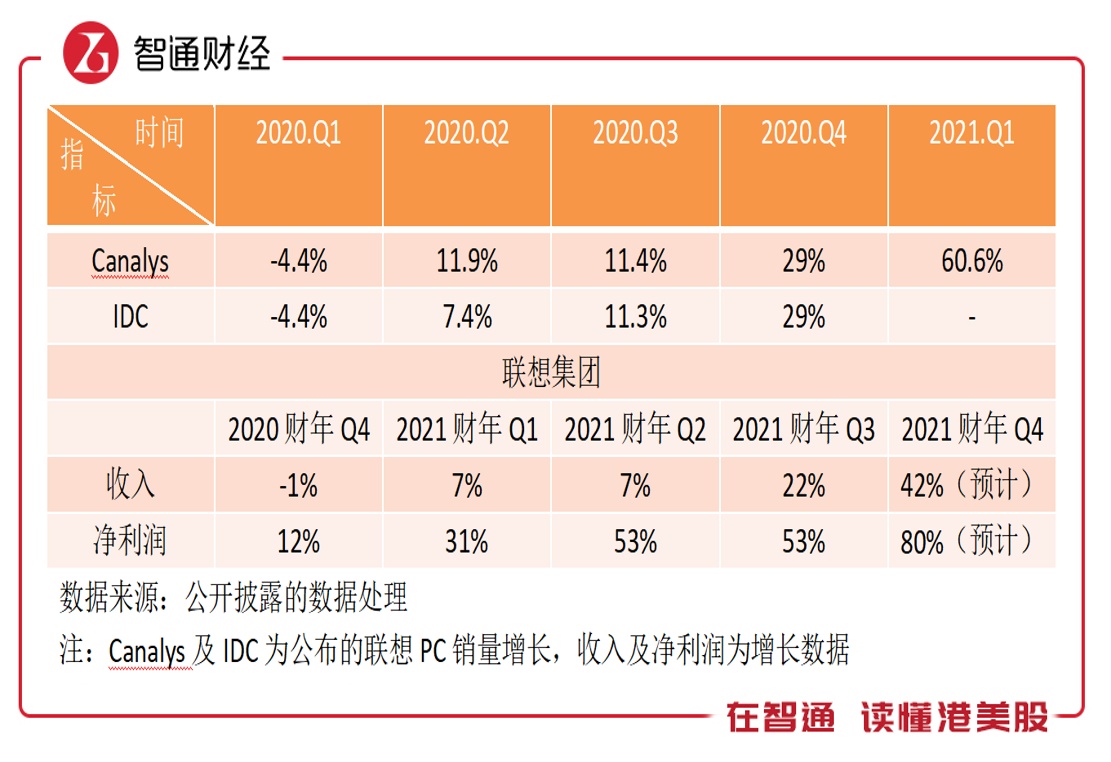 从IDC及Canalys公布的季度销量与联想过往业绩对照看,基本趋势一致,联想收入增长水平大致在销量增长的70-80%的区间,正好对应其PC业务的收入份额。利润相关性不大,但联想保持高增长水平,说明产品售价提升,高端化策略,以及降本增效显著。根据Canalys销量报告,预计联想在2021财年第四季度收入增长或将超过40%。