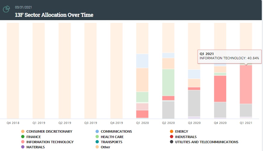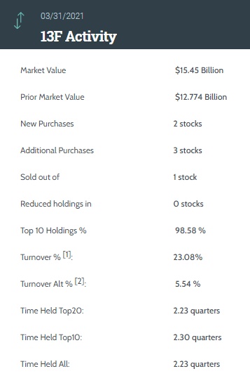 据统计,公共投资基金一季度持仓总市值达154.5亿美元,上一季度总市值为127.74亿美元,环比增长21%。公共投资基金在一季度的持仓组合中新增了2只个股,增持了3只个股,减持了0只个股,清仓了1只个股。其中前十大持仓标的占总市值的98.58%。