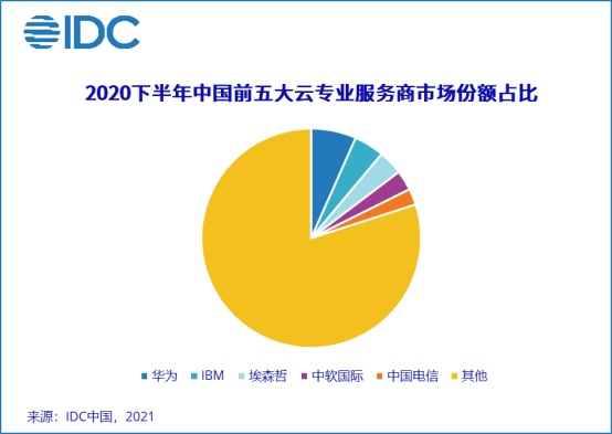 从整个云专业服务市场来看,云专业服务市场较为分散但趋于集中,市场份额占比位居前五的服务商所占份额正逐渐提升,2020下半年占比达20%。