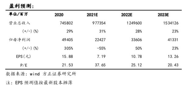 3、盈利预测:我们持续看好公司长远发展和后续业绩的增长。我们预计2021-2023年营业收入分别为9,773/12,496/15,341亿元,净利分别为224 /336 /413亿元,对应EPS为7.2 /10.8/13.2元,对应PE 38/25/20X。我们给予目标PE 38X,21年目标价格328港币,维持“推荐”评级。