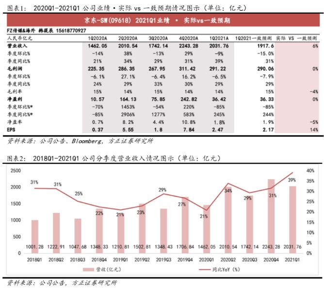 京东(09618)于2021年05月19日发布2021年Q1季度业绩报告。单季新增用户2780万,年度活跃购买用户数达4.998亿(YoY +29%,QoQ +6%)。公司2021Q1实现营业收入2031.76亿元(YoY +39%,QoQ -9%),毛利润291.22亿元(YoY +29%, QoQ -7%),Non-GAAP 归母净利润为39.68亿元(YoY +34%),GAAP归属普通股东净利润为36.17亿元(YoY +237%)。