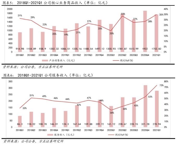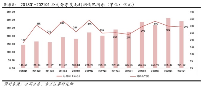 1、主要财务指标分析:2021Q1公司实现营业收入2031.76亿元(YoY +39%,QoQ -9%),毛利润291.22亿元(YoY +29%, QoQ -7%),Non-GAAP 归母净利润为39.68亿元(YoY +34%),GAAP归属普通股东净利润为36.17亿元(YoY +237%)。