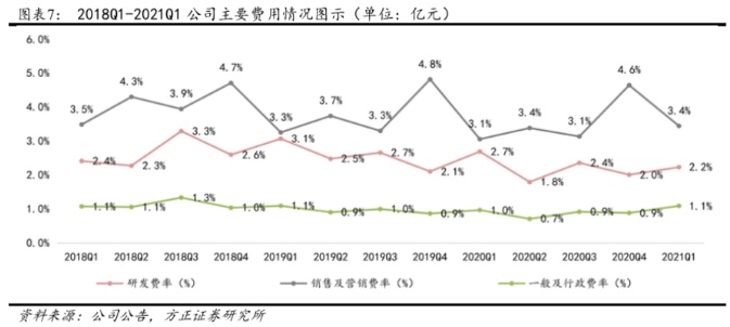 费用情况:2021Q1公司研发费用率2%,销售及营销费用率3%, 一般及行政费用率1%。