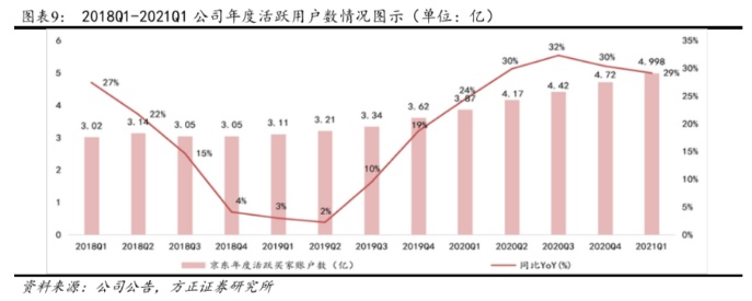 2.年活跃用户创历史新高,下沉市场不断带来惊喜:京东2021Q1新增用户2780万,年度活跃用户达4.998亿,到达历史高位。“京东式下沉”惊喜不断,第一季度下沉市场的新用户的比例首次达到了81%,可见京东还有很大的用户增量空间。