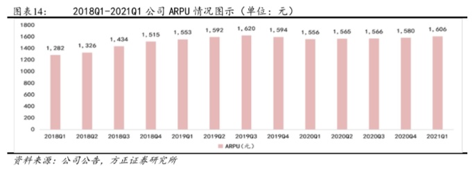 (4)ARPU:截至2021年3月,公司年度ARPU为1606元(YoY +3%)。