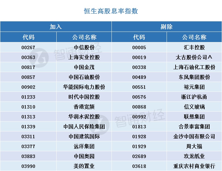 其中,恒生高股息率指数新加入13家公司,分别是中信股份(00267)、上海实业控股(00363)、中国金茂(00817)、中国石油股份(00857)、华能国际电力股份(00902)、时代中国控股(01233)、香港宽频(01310)、华润水泥控股(01313)、中国人民保险集团(01339)、中国建筑国际(03311)、远洋集团(03377)、中国奥园(03883)、美的置业(03990)。