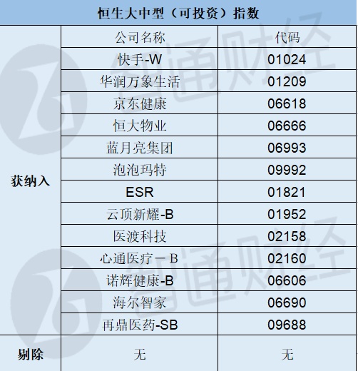 快手-W(01024)、华润万象生活(01209)、京东健康(06618)、恒大物业(06666)、蓝月亮集团(06993)、泡泡玛特(09992)、ESR(01821)、云顶新耀-B(01952)、医渡科技(02158)、心通医疗-B(02160)、诺辉健康-B(06606)、海尔智家(06690)和再鼎医药-SB(09688)获纳入恒生大中型股(可投资)指数。