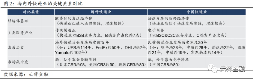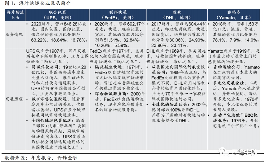 放眼海外,美欧日等发达国家的快递业起步较早,部分具备核心竞争力的快递企业实现跨越时代的发展,一步步成为当今的行业巨头,如美国的联合包裹(UPS)、联邦快递(FedEx),德国的敦豪(DHL),以及日本的雅玛多(Yamato)。UPS抓住美国西部运动带来的商业机会,从同城信使、同城零售包裹配送,不断演化成为全国性的陆运包裹配送快递巨头。