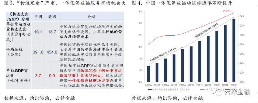 以中美对比为例,中国的“单位货运吞吐量物流支出”、“平均运程”均低于美国,主要系“单位GDP货运量”拖累中国物流效率低于美国。可借助一体化供应链物流服务可降低重复运输、空载率等情况,进而降低“单位GDP货运量”,提升国内物流效率。