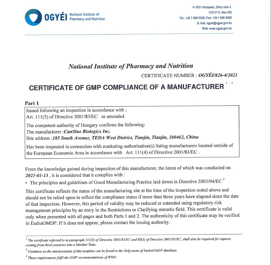 1月13日,匈牙利国家药品与营养研究院对康希诺生物进行了GMP审查,判定康希诺生物符合欧盟GMP标准和指导原则,并于5月21日,正式向康希诺生物颁发欧盟通用GMP证书。