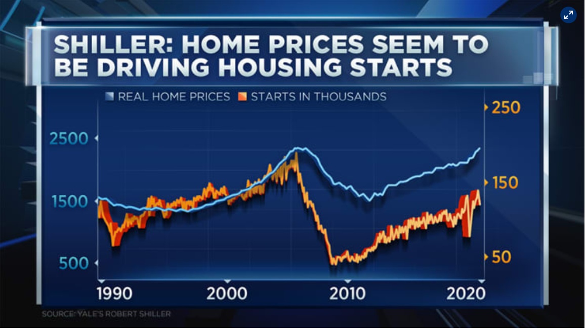 Shiller发现,在过去30年里,房价似乎推动了新屋开工。现在,他看到这种模式再次出现。