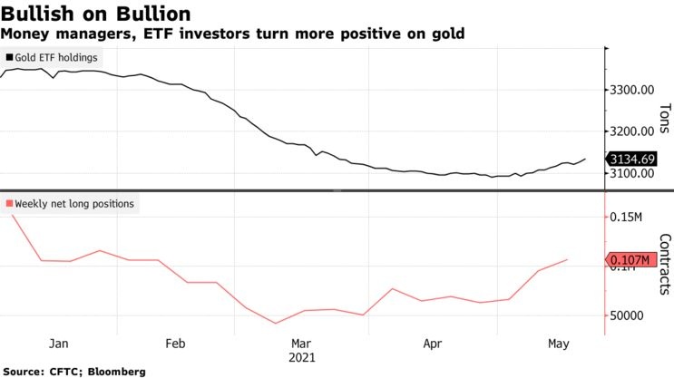 上周五公布的数据显示,对冲基金经理将黄金净多头头寸增至16周来最高水平。彭博社收集的数据显示,在金价连续三个月坚挺之后,5月份,黄金交易所交易基金出现资金流入。
