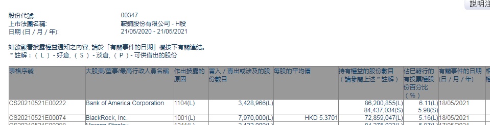 智通财经APP获悉,香港联交所最新资料显示,5月18日,贝莱德集团增持鞍钢股份有限公司(00347)797万股,每股作价5.3701港元,总金额约为4279.97万港元。增持后最新持股数目约为7285.9万股,最新持股比例为5.16%。